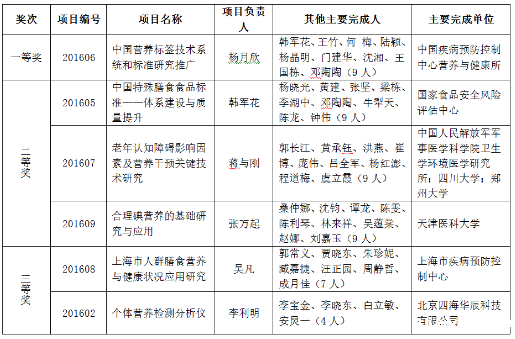 | 1 | 一等奖 | STR202208101 | 中国人群膳食铁、锌参考摄入量研究 | 杨晓光 | 杨晓光、杨丽琛、王军、马玉霞、常素英、李敏、李雅杰、毛德倩、张宇、卢佳希 | 中国疾病预防控制中心营养与健康所、中国计量科学研究院、河北医科大学 |