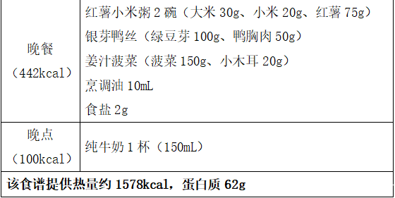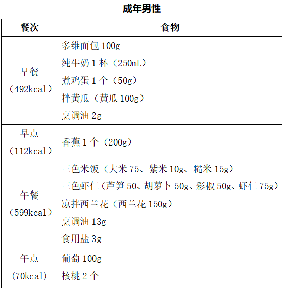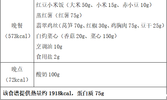 同时还要注意以下原则:1.主食中最好有1/3的粗杂粮和杂豆类,比如燕麦,玉米,红豆等;2.蔬菜的选择要多“色”,红绿黄等深颜色的蔬菜要占到1/2以上,土豆、山药、莲藕等块茎类的蔬菜要当成主食来吃;3.肉类要挑肥拣瘦,优先选择鱼禽类,吃鸡蛋不要扔掉蛋黄;4.每天喝点牛奶,多吃点豆制品,一周吃几次坚果;5.注意烹调方法,少盐少油;在外就餐时尽量少选油炸油煎和口味重的食物;6.足量饮水,每天7~8杯水,总量达到1500~1700ml左右。不喝或者少喝含糖饮料。(食谱举例而言)