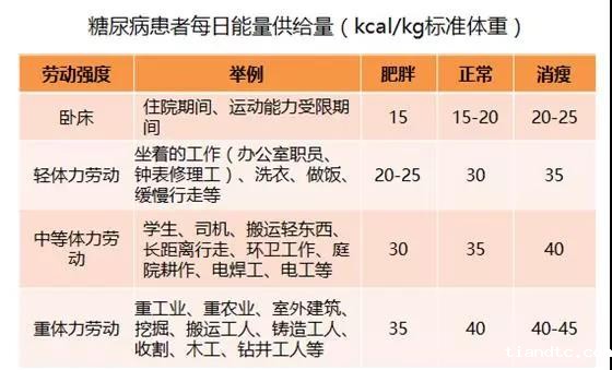 糖尿病患者应注意能量摄入和能量消耗保持平衡,每日能量供给量与年龄、体型、劳动强度等因素相关,一般来说: